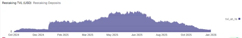 目前,Jito的总TVL约为20.26亿美元,年平均收益率为5.94%,再质押总TVL约为4,633万美元美元。Jito再质押趋势如下图所示,整体呈现出阶段性扩张后进入回落调整的形态。其再质押 TVL 在 2024 年末至 2025 年上半年持续增长,并于 2025 年二季度达到高点;此后资金规模逐步下降,至2025年下半年进入明显回落阶段,表明再质押由早期快速扩张逐步转向去杠杆与结构性调整阶段,市场对再质押的配置态度趋于谨慎。