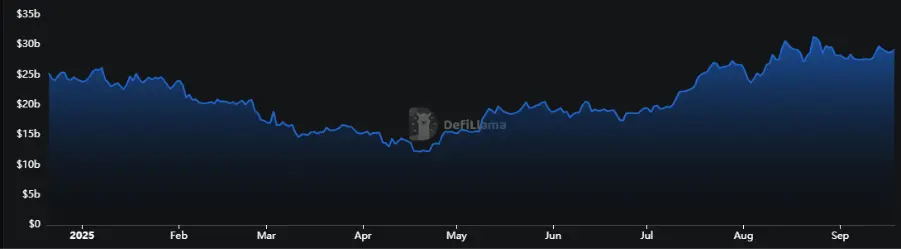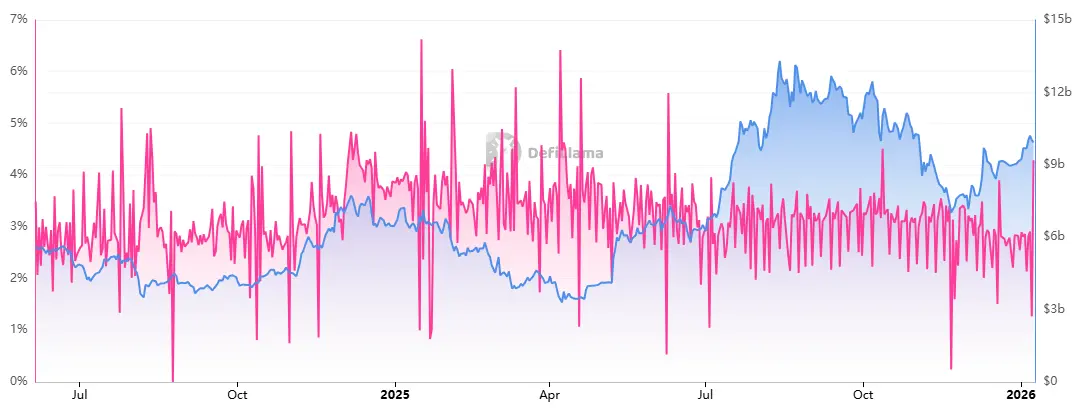 EtherFi的收益来源包括以太坊网络的原生质押奖励和通过 EigenCloud 的再质押机制获取的额外收益。平台还从用户的质押收益中收取一定比例作为平台收入。据 DefiLlama数据,EtherFi的总TVL约为87.03亿美元,平均年收益率为4.29%。从时间序列上看,EtherFi 的收益率整体表现相对平稳,而其TVL 在 2025 年中期出现阶段性扩张,随后回落并进入区间震荡。