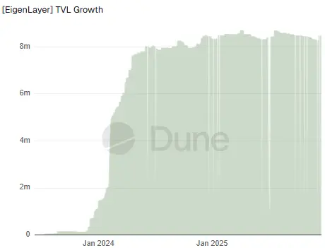 一个更细节的观察点是,从下图EigenCloud的原生再质押中ETH的总锁仓量(TVL)增长趋势上看,自2024年1月到6月,EigenCloud引来井喷式增长后,其ETH的总TVL(即占比最大的原生再质押)一直维持在800万美元的区间波动,后期并未有更大的增量涌入。