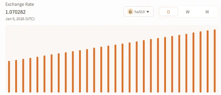 初始阶段,1 haSUI 对应 1 SUI;随着质押收益的持续累积,汇率逐步提升。目前,该汇率已稳定上升至约 1.07,代表每 1 枚 haSUI 背后实际对应的 SUI 资产已较初始增长约7%。这种机制有效实现了自动复利,使用户无需频繁手动提取和再质押收益,适合长期持有者持续积累回报,也体现了Haedal 质押机制的稳健性和透明性。