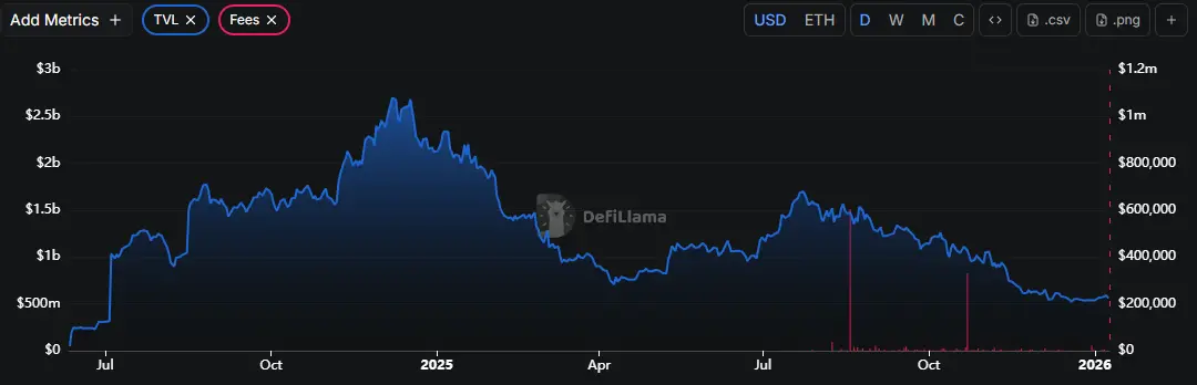 值得留意的是,Pendle自在2024年年初开始,其交易量有指数级增长。截止至目前,Pendle累计交易规模已接近900亿美元,整体增长节奏较为平滑,未出现剧烈回撤。这表明Pendle的交易活动并非由单一事件或短期激励驱动,而是伴随产品使用场景扩展与用户活跃度提升逐步累积。