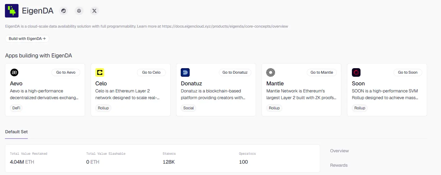它最大的优势在于直接租用了以太坊现有的庞大信用体系。通过EigenCloud,那些已经在以太坊上质押了 ETH 的用户,可以选择把这些资产再质押资产给 EigenDA 的验证者。这意味着,如果有人想攻击EigenDA,其实质上是在挑战价值数百亿美元的 ETH 安全屏障。对于 Rollup 开发者来说,这省去了自行建设安全网络的巨额成本,直接实现了“拎包入住”般的安全性。