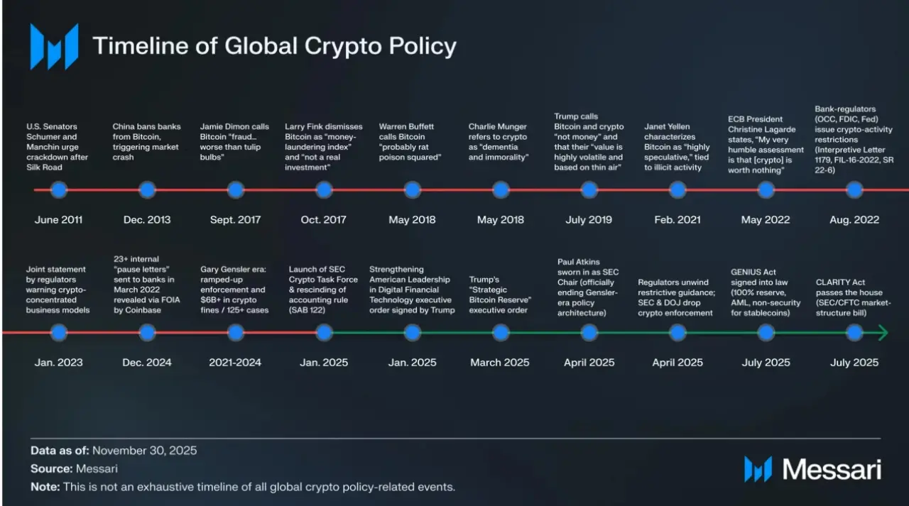 在过往周期中,监管更多以负面方式介入市场:要么在行情高点通过禁令、调查或执法打断风险偏好,要么在熊市中以追责形式集中释放不确定性。这种模式下,政策往往既无法有效保护投资者,也难以为行业提供长期发展预期,反而加剧了周期的剧烈波动。而进入 2025 年,这一治理方式开始发生结构性变化:行政令先行、监管机构口径趋同、立法框架逐步推进,逐步取代此前以个案执法为主的监管模式。