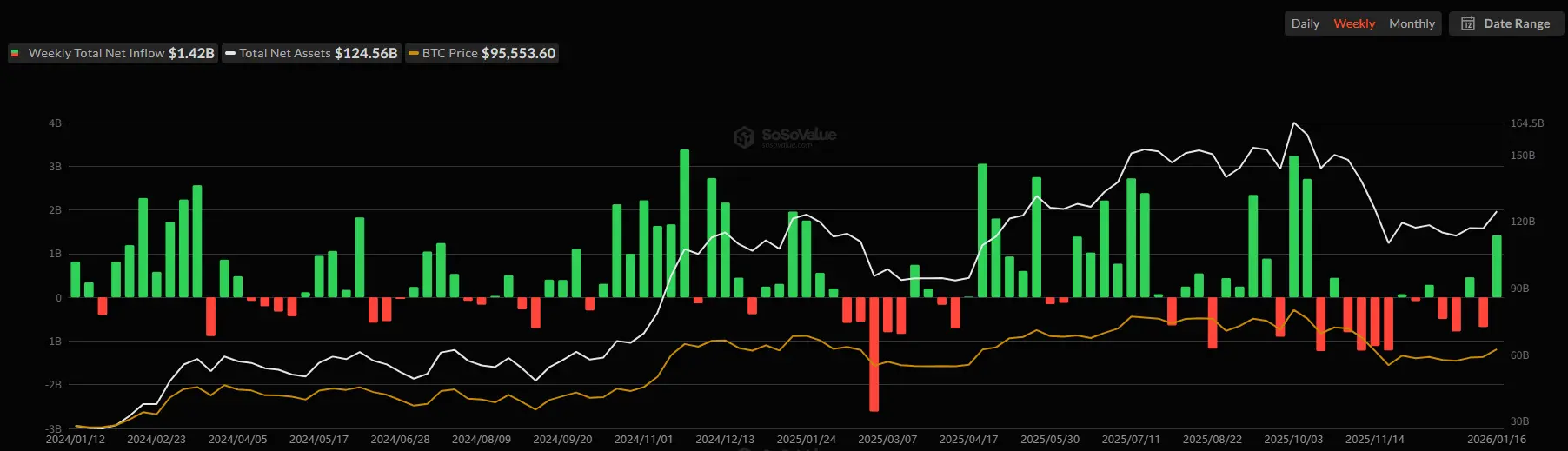 截止至发稿,美国比特币现货ETF累计总净流入约578.2亿美元,本周净流入14.2亿美元;美国以太坊现货ETF累计总净流入约129.1亿美元,本周净流入4.79亿美元。