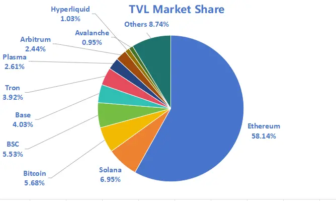 按公链进行划分,其中TVL最高的三条公链分别是Ethereum链,占比58.14%;Solana链,占比6.95%;Bitcoin,占比5.68%。
