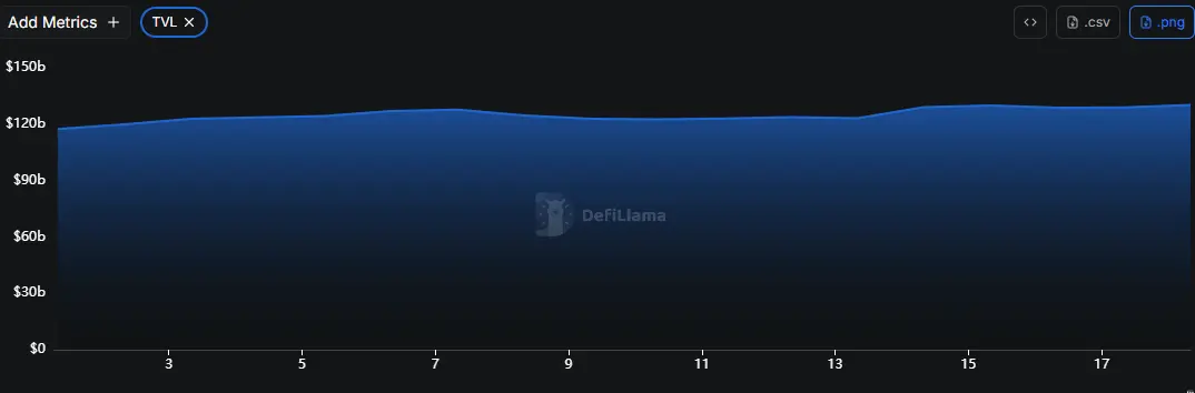 据DeFiLlama的数据,本周DeFi总TVL为1,302亿美元,较上周1,239亿美元,上升约5.08%。