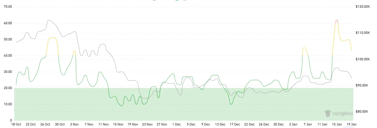 加密货币恐慌指数为43,显示为中性。