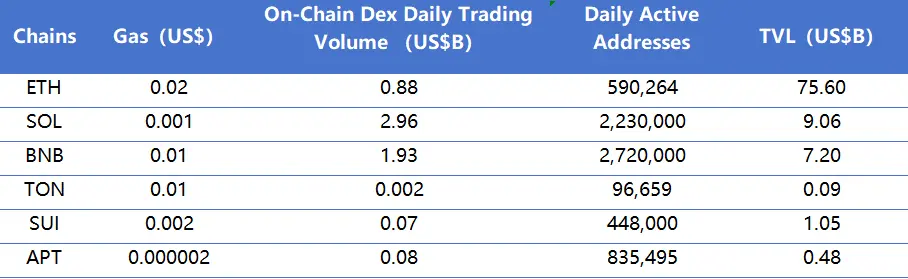 主要从链上DEX日成交量、日活跃地址、交易费用分析目前主要Layer1含ETH、SOL、BNB、TON、SUI以及APT的相关数据。