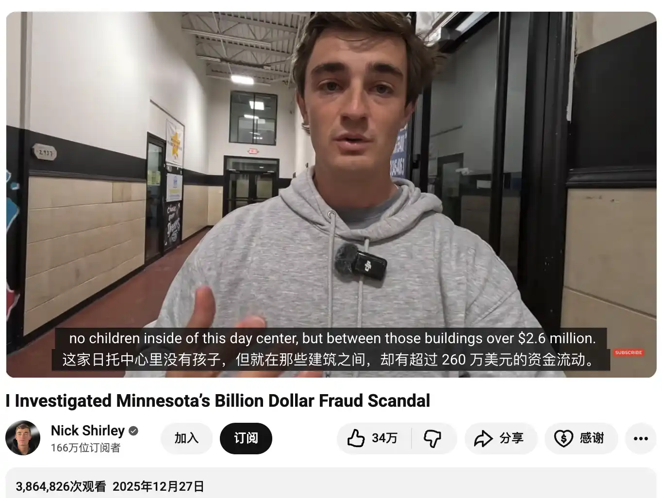 2025 年 12 月,Nick Shirley 发了条 42 分钟的调查视频「一夜爆红」。他在视频里揭露了一批打着「儿童营养」「弱势群体援助」旗号的非营利组织,这些组织向州政府和联邦政府申请资金,账面上表示服务对象成千上万,但实际上大量儿童并不存在,儿童餐食也并不存在,所谓的公益项目只是用来套取财政拨款的壳。