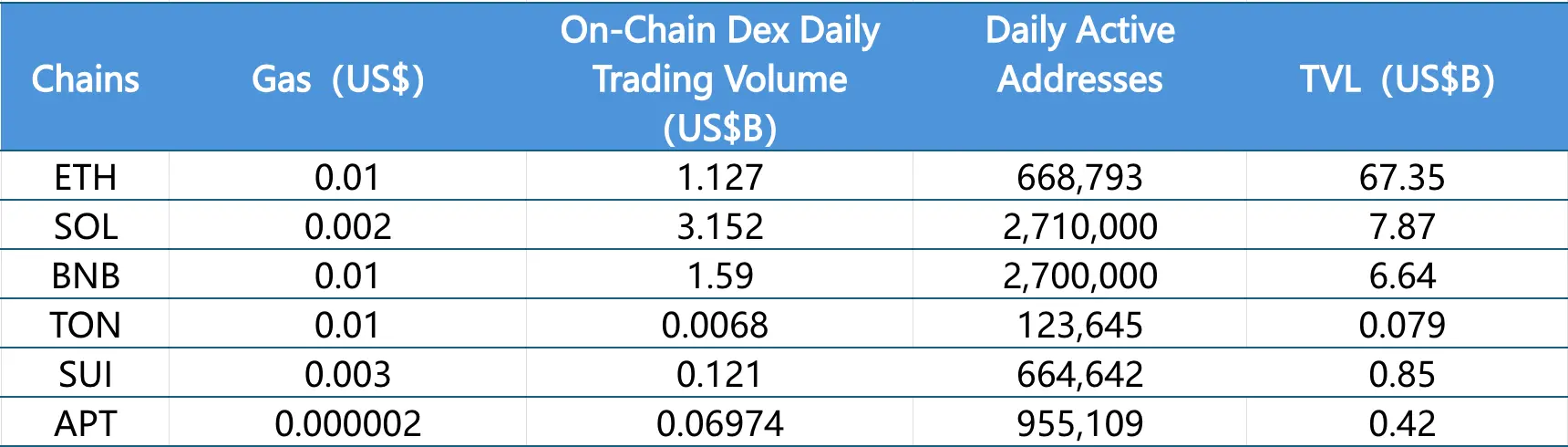 主要从日交易量、日活跃地址、交易费用分析目前主要Layer1含ETH、SOL、BNB、TON、SUI以及APTOS的相关数据。