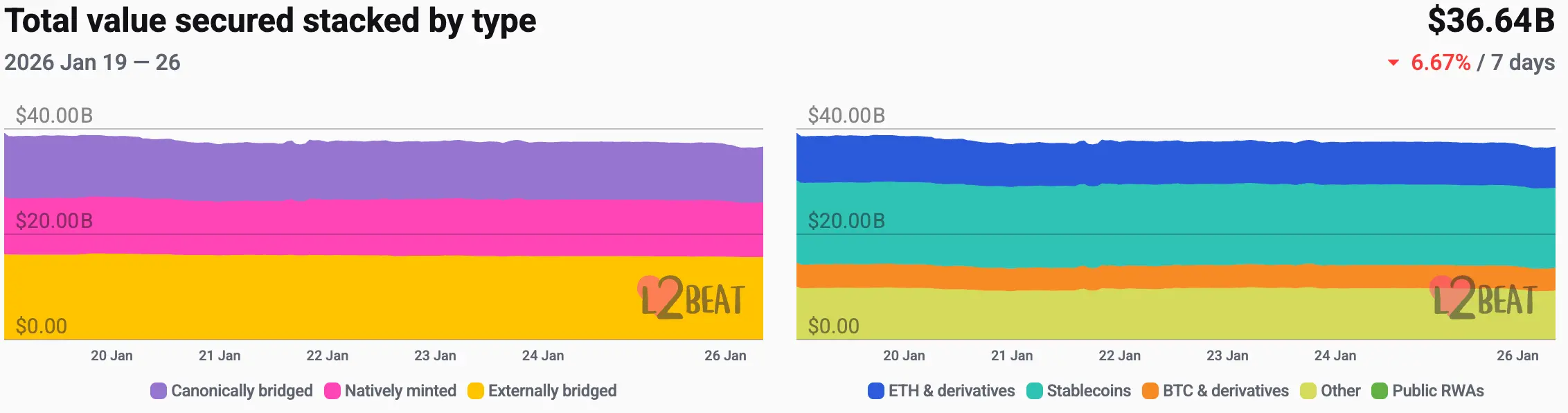 据L2Beat数据显示,以太坊 Layer 2总TVL为366.4亿美元,本周较上周($393.6亿)整体跌幅为6.91%。