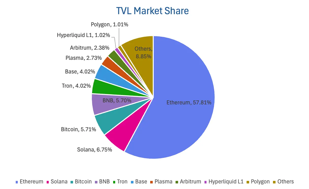 按公链进行划分,其中TVL最高的三条公链分别是Ethereum链,占比57.81%;Solana链,占比6.75%;Bitcoin,占比5.71%。