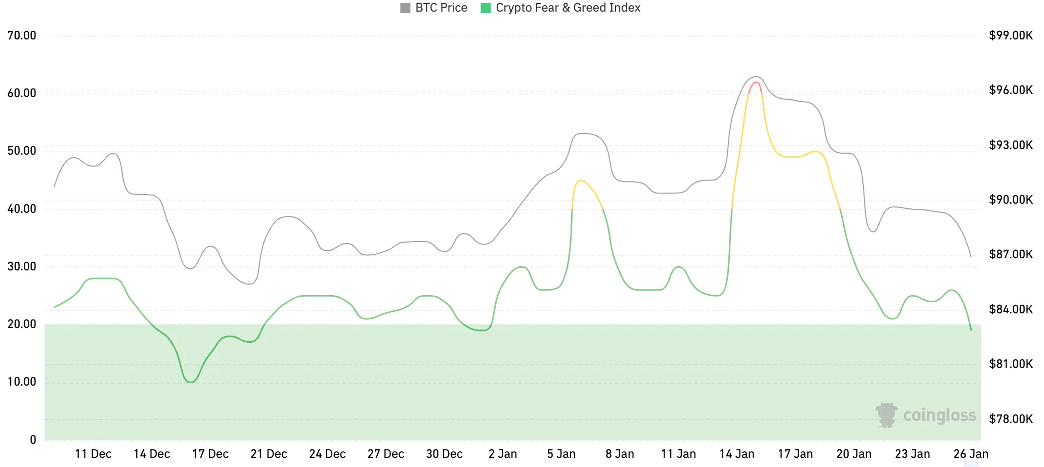 加密货币恐慌指数为19,显示为极度恐慌。