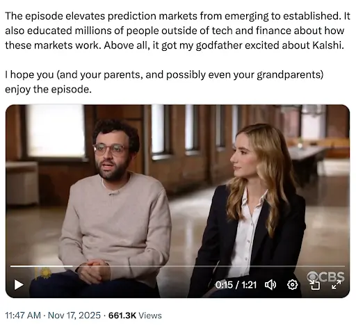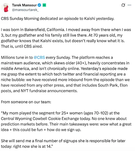 当 Kalshi 的创始团队最近做客《CBS 周日早晨》节目时,他们触达了一群与推特科技圈那些“时刻在线”的用户截然不同的受众。Kalshi 首席执行官 Tarek Mansour 分享了一位团队成员母亲的故事,生动体现了通过传统媒体触达不同圈层的力量: