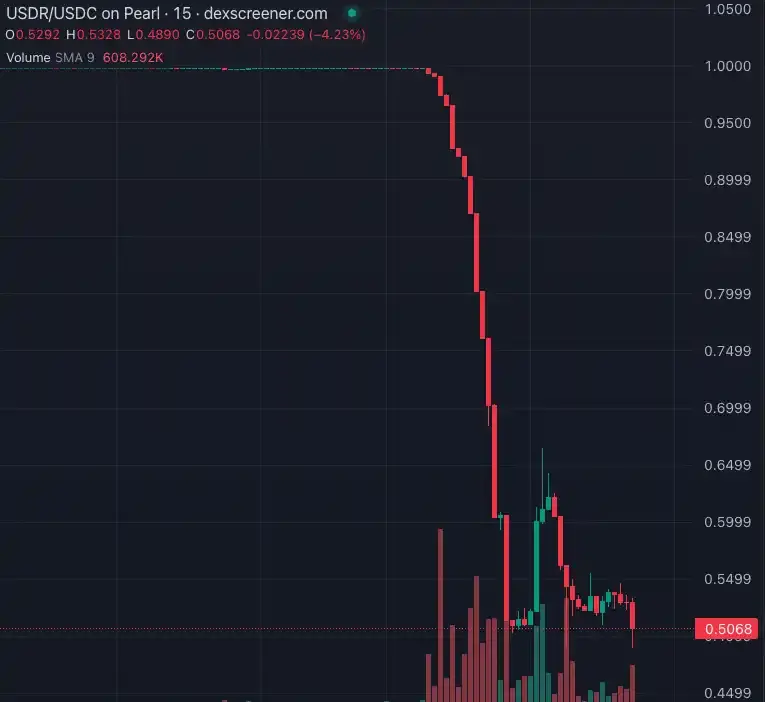 流动性是 RWA 项目最容易伪造但也最容易崩塌的环节[2]。许多 RWA 项目上线初期的盘面深度高度依赖做市商补贴。一旦做市协议到期或补贴停止,二级市场深度往往会出现断崖式下跌,买单瞬间消失。 此外,链下资产估值的低频性(通常为月度或季度 NAV)与链上交易的高频性(秒级出块)存在天然的时间错配。当链上出现大额抛售时,AMM 池往往因为缺乏实时的公允价值指引而无法快速回补,导致价格严重偏离净值,形成流动性黑洞。以下图 $USDR 为例,由于发生挤兑,代币价格在几个小时内迅速从 1 美元跌到 0.5 美元[5]。
