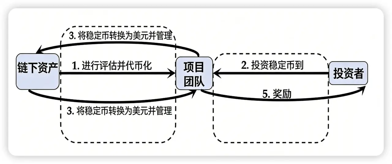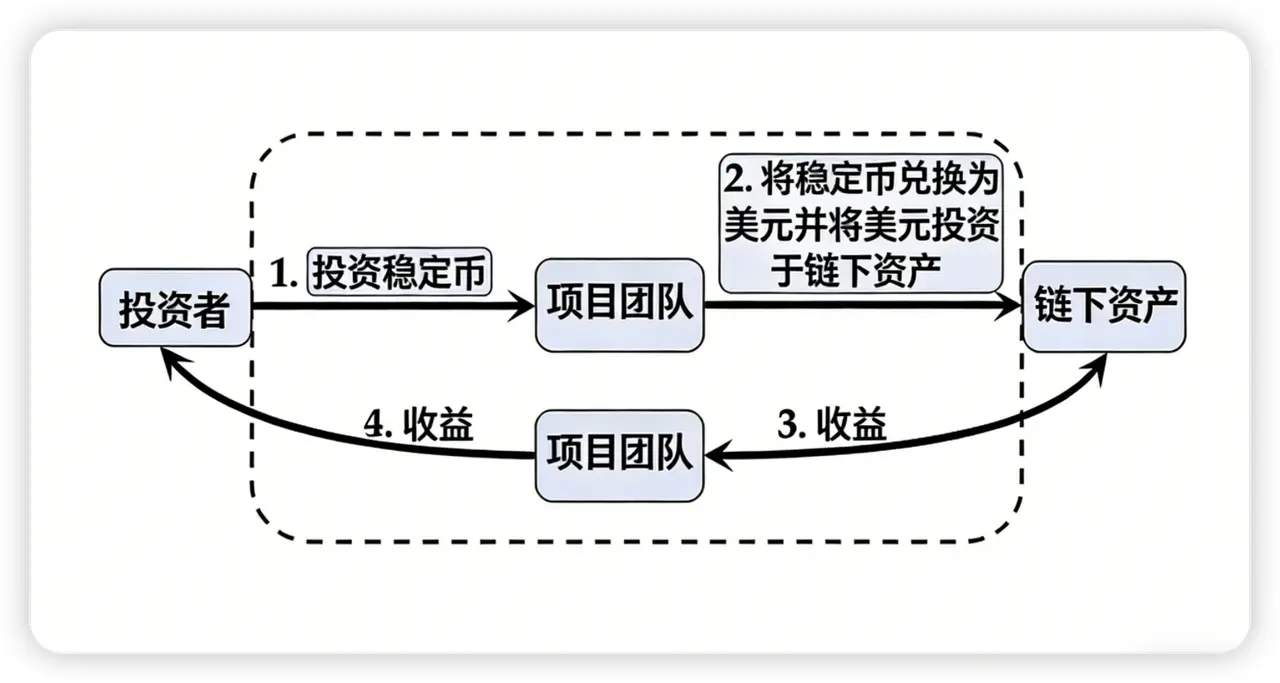 这是目前最常见的模式,本质是链上集资,链下理财。投资者在链上质押稳定币(如 USDC)→ 项目方归集后兑换为法币(USD)→ 投资于链下高流动性资产(如美国国债)→ 获得的利息收益回流链上,分发给代币持有者。