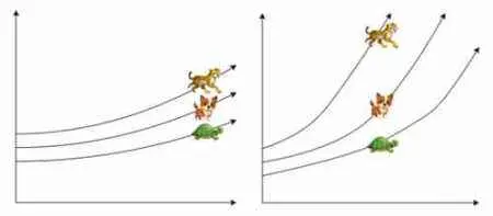 左图:成比例增长 —— 初始阶段的微小差距,最终仍会保持微小;右图:规模经济下的增长 —— 初始阶段的微小差距,会随时间推移变得极大。