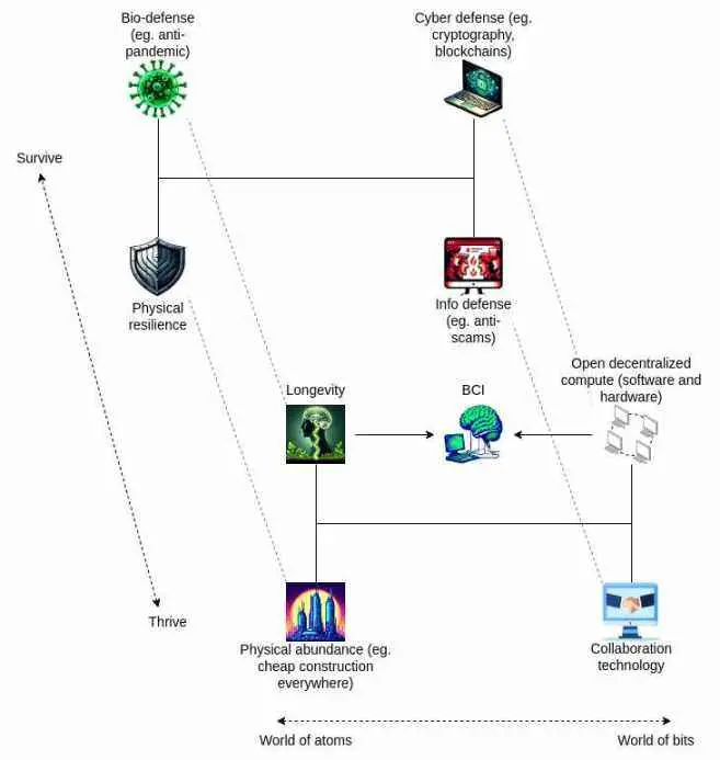 D/acc(防御性加速主义,Defensive Accelerationism)是一种互补性策略,它能让「减少权力集中」的目标更安全地实现。其核心是「构建与进攻性技术同步发展的防御性技术」,且这类防御技术需具备开放性与普惠性,让所有人都能获取 —— 通过这种方式,降低人们因「安全焦虑」而寻求权力集中的需求。