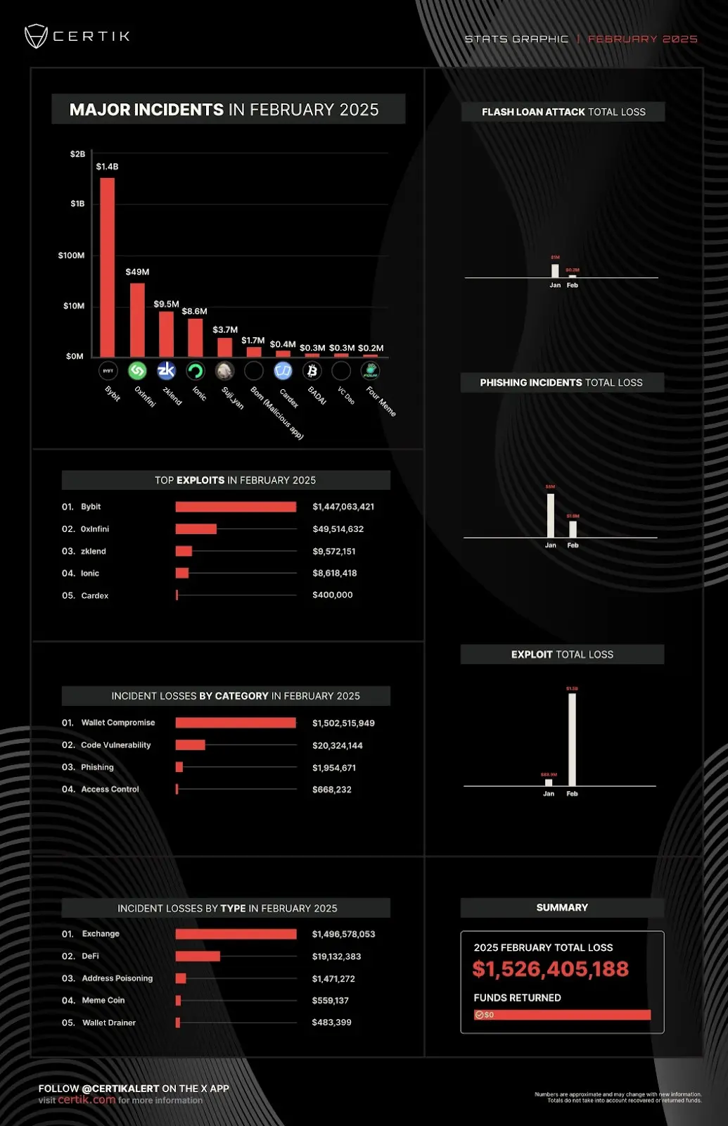 在所有已披露事件中,2025 年 2 月发生的 Bybit 安全事件 被认为是当年最严重的单一攻击案例。根据 CoinTelegraph 与 Business Insider 的报道,该事件涉及约 14 亿美元的数字资产损失,成为加密行业历史上规模最大的黑客事件之一。
