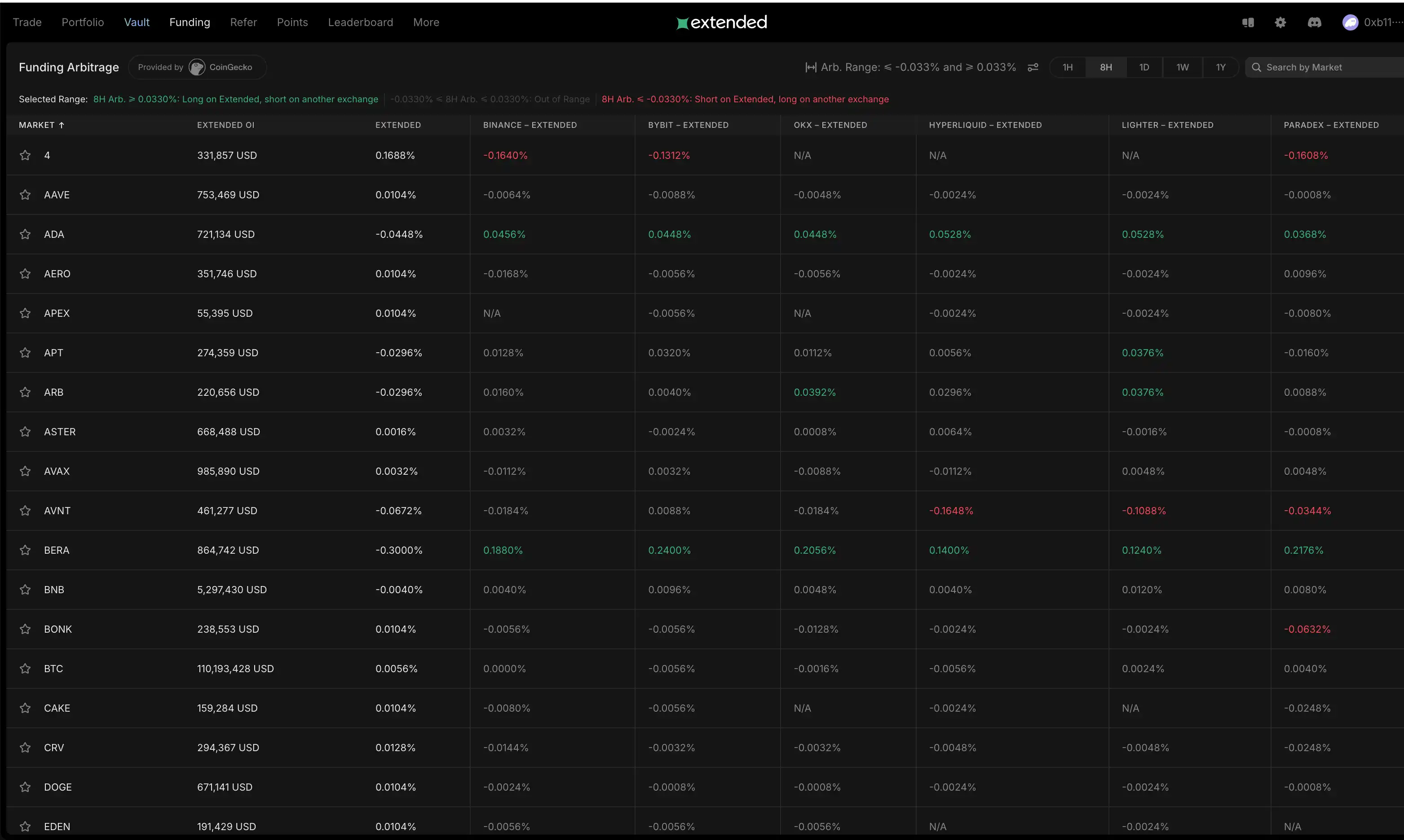 这样操作有什么好处?首先,多空对冲后,你对 BTC 价格涨跌是完全中性的,涨跌都不影响你的总资产。其次,Variational 上你做多要付资金费,但 Extended 上你做空能收资金费。如果 Extended 的费率更高,你就能赚到这个差价。