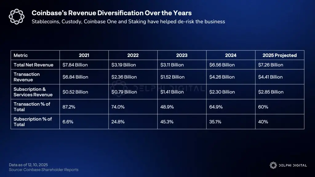 Coinbase 最初严重依赖交易活动作为其商业模式,但现在已实现多元化发展。2025 年第三季度,稳定币收入达到 3.547 亿美元。与 Circle 账户持有的美元储备相关的收入每季度到账,无需依赖市场活动。