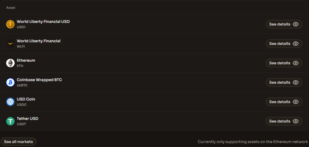 WLFI Markets 目前支持的币种 | 图源:WLFI 官网