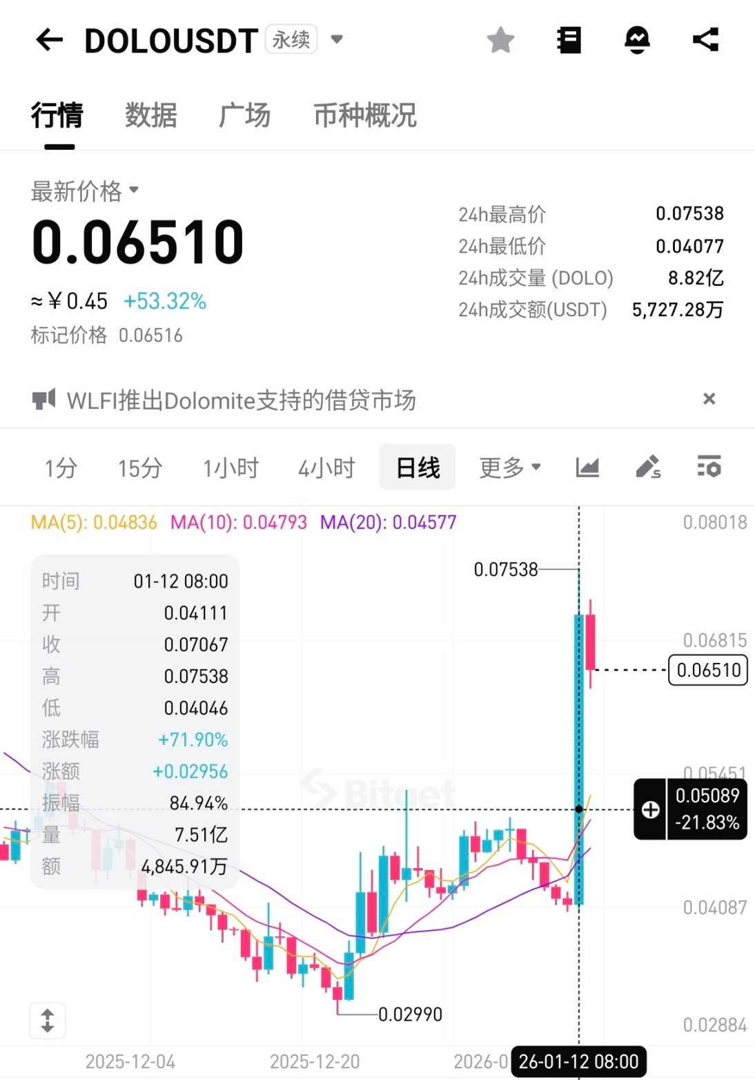 平台发布后立刻引发市场反馈。作为底层协议架构提供方的 Dolomite,其原生代币 DOLO 当日收涨 71.9%。