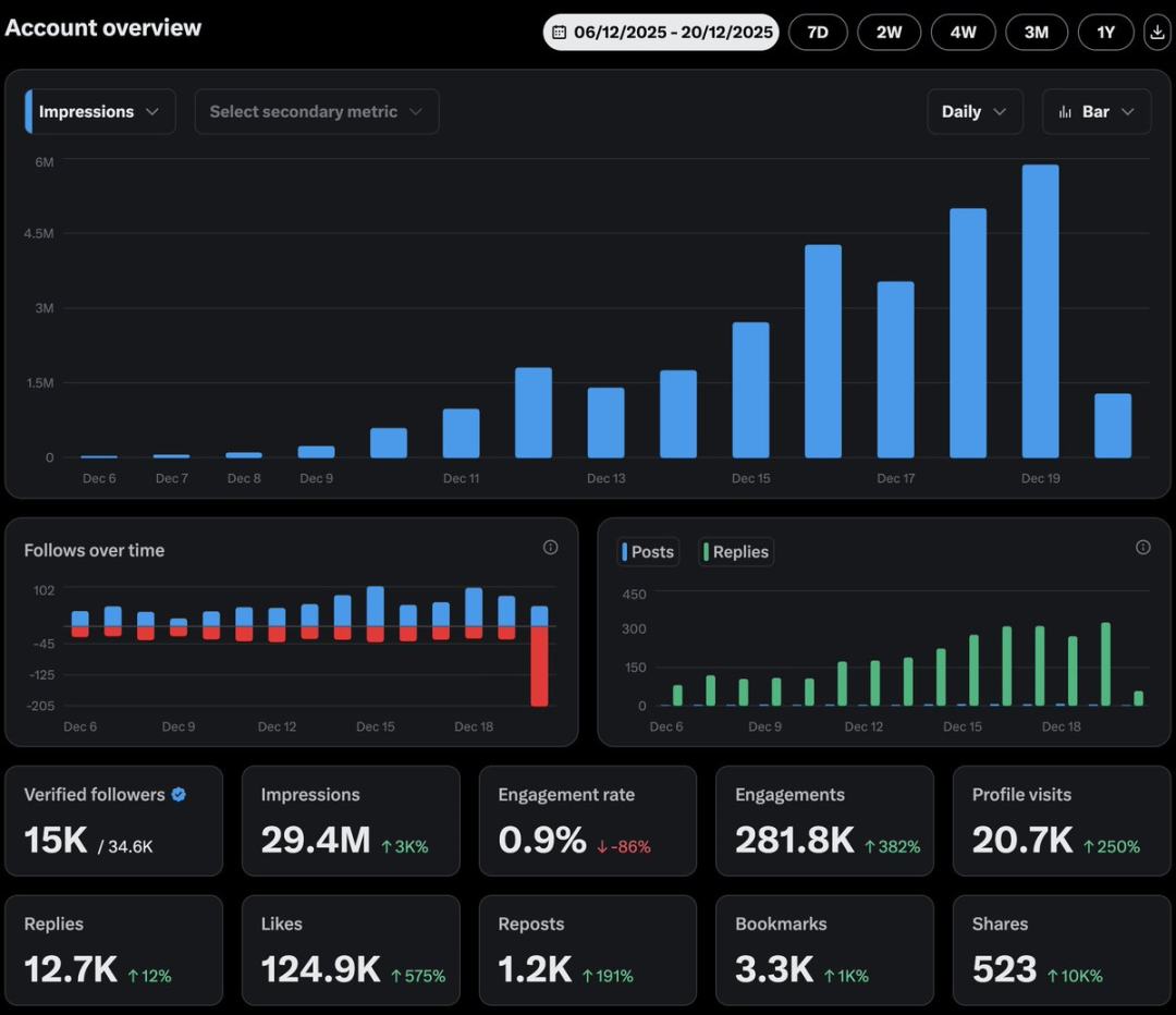 能变现的,只是高质量付费用户的互动。撰文:MAD Vincent编译:Chopper,Foresight News我完全照他们说的做了:疯狂刷屏评论、紧盯头部大号蹭流量、哪里热门往哪凑,把曝光量当成牛