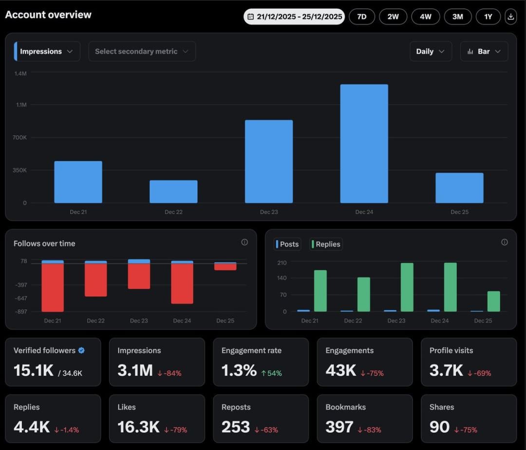 这是一条警示。2025 年的今天,还在 X 平台刷曝光量的人,既算不上抢占先机,也谈不上埋头苦干,不过是机器人流量的接盘侠。