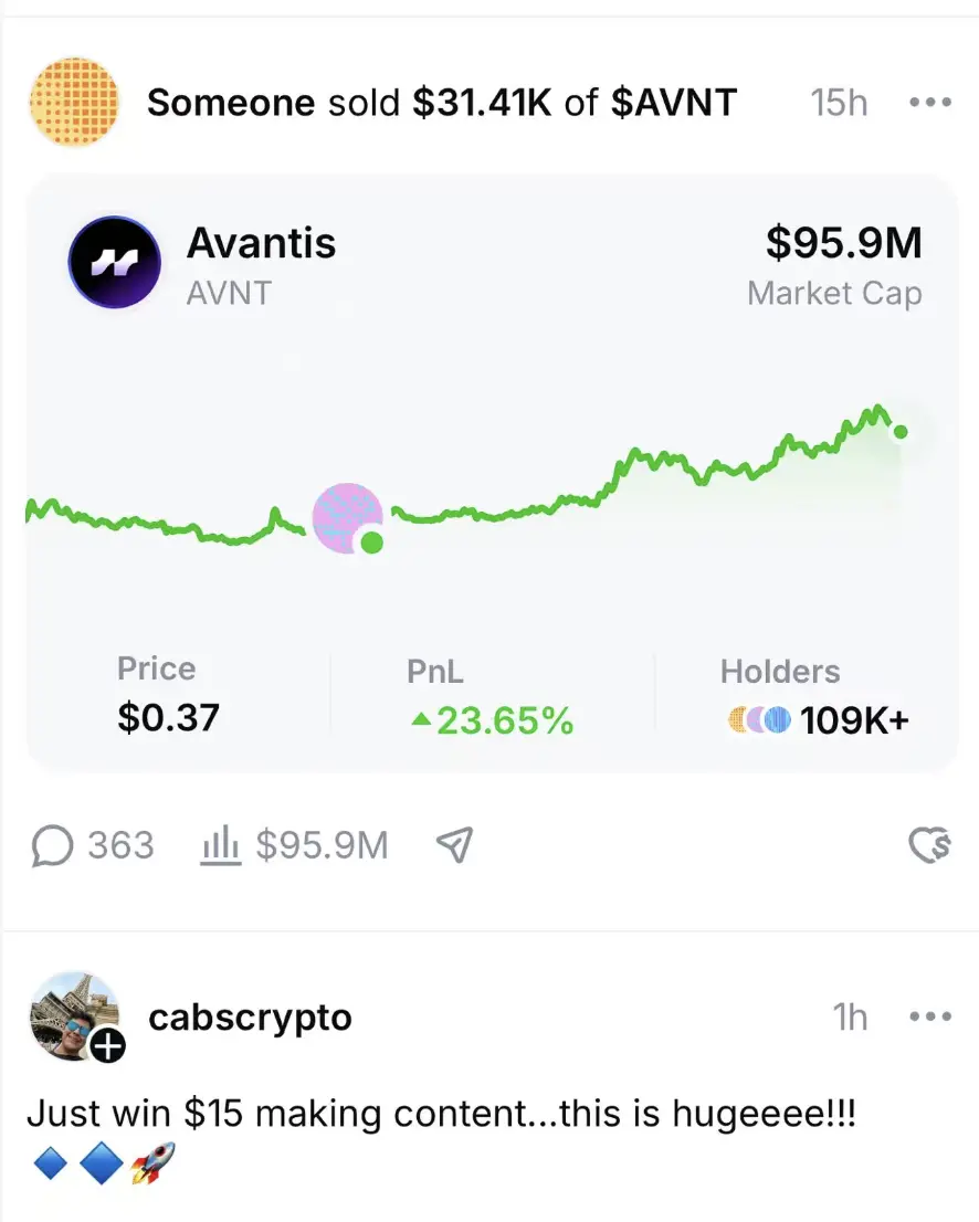 - 社交与创作者经济的闭环: 集成 Farcaster 与 Zora 协议。用户发布的每一条动态都能通过 Zora 转化为可交易的数字资产,实现真正的「发帖即变现」。同时,社交流中直接整合了精选交易动态,让「链上发现」变得直观且具社交属性。