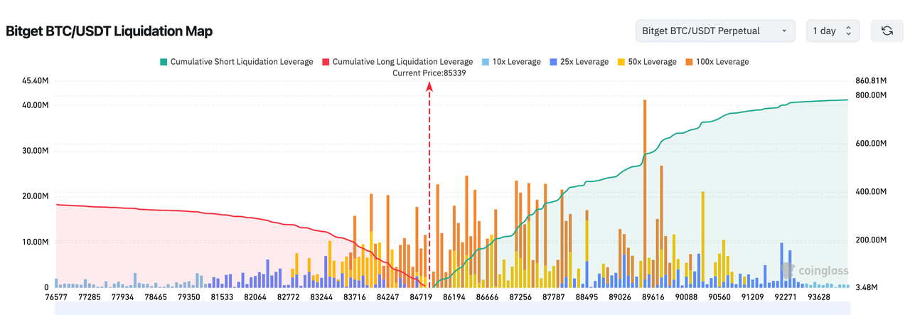 3、Bitget BTC/USDT清算地图显示:当前价85,339美元正处于多头清算密集区,上方86,500–89,000区间堆积大量50x–100x多单,一旦突破将触发多头挤仓瀑布式上涨,直冲90k ;下方空头清算墙极薄,跌破84k几乎无强支撑,市场多头情绪极度拥挤,假突破猎杀风险高企。