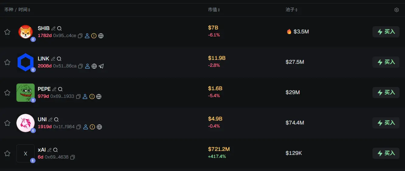 过去 24h ETH 热门代币前五依次为:SHIB、LINK、PEPE、UNI、xAI