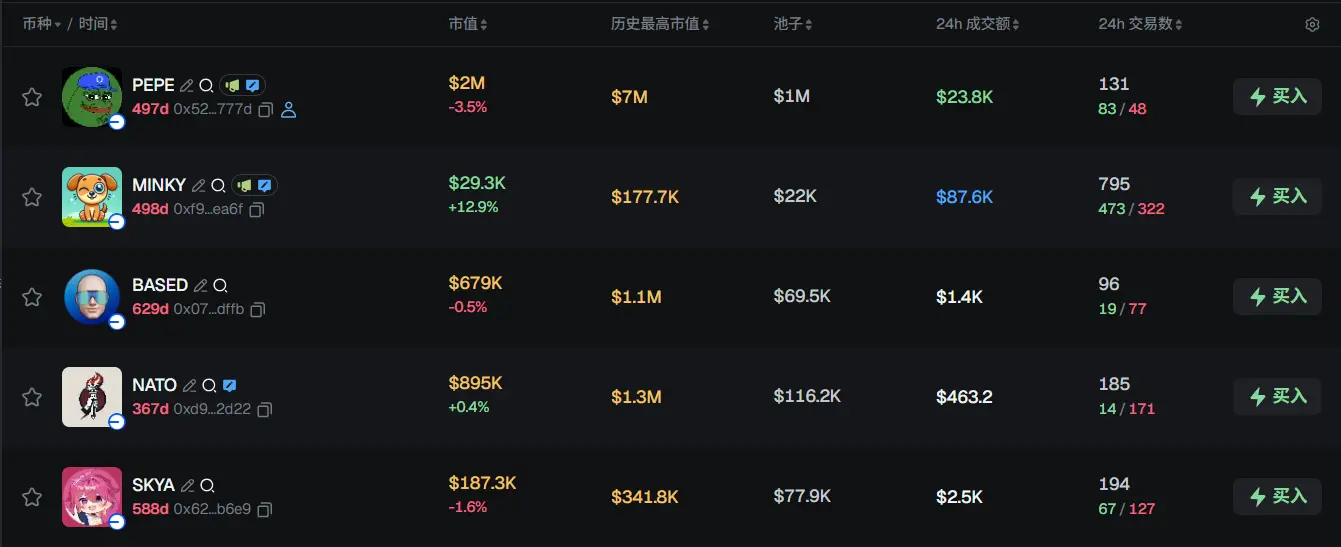 过去 24h Base 热门代币前五依次为:PEPE、MINKY、BASED、NATO、SKYA