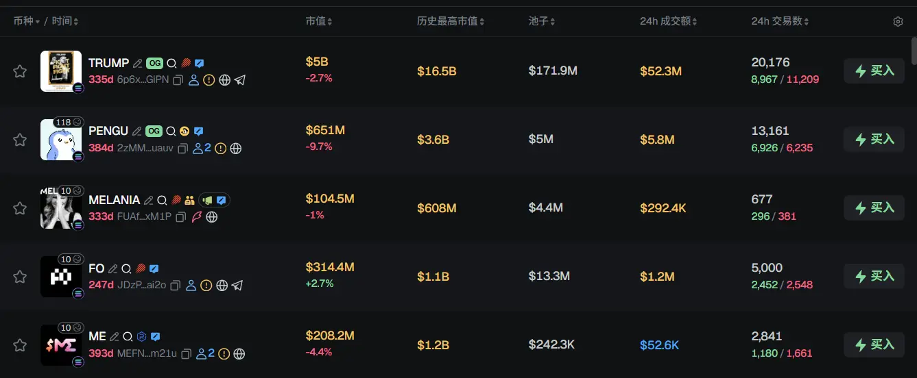 过去 24h Solana 热门代币前五依次为:TRUMP、PENGU、MELANIA、FO、ME
