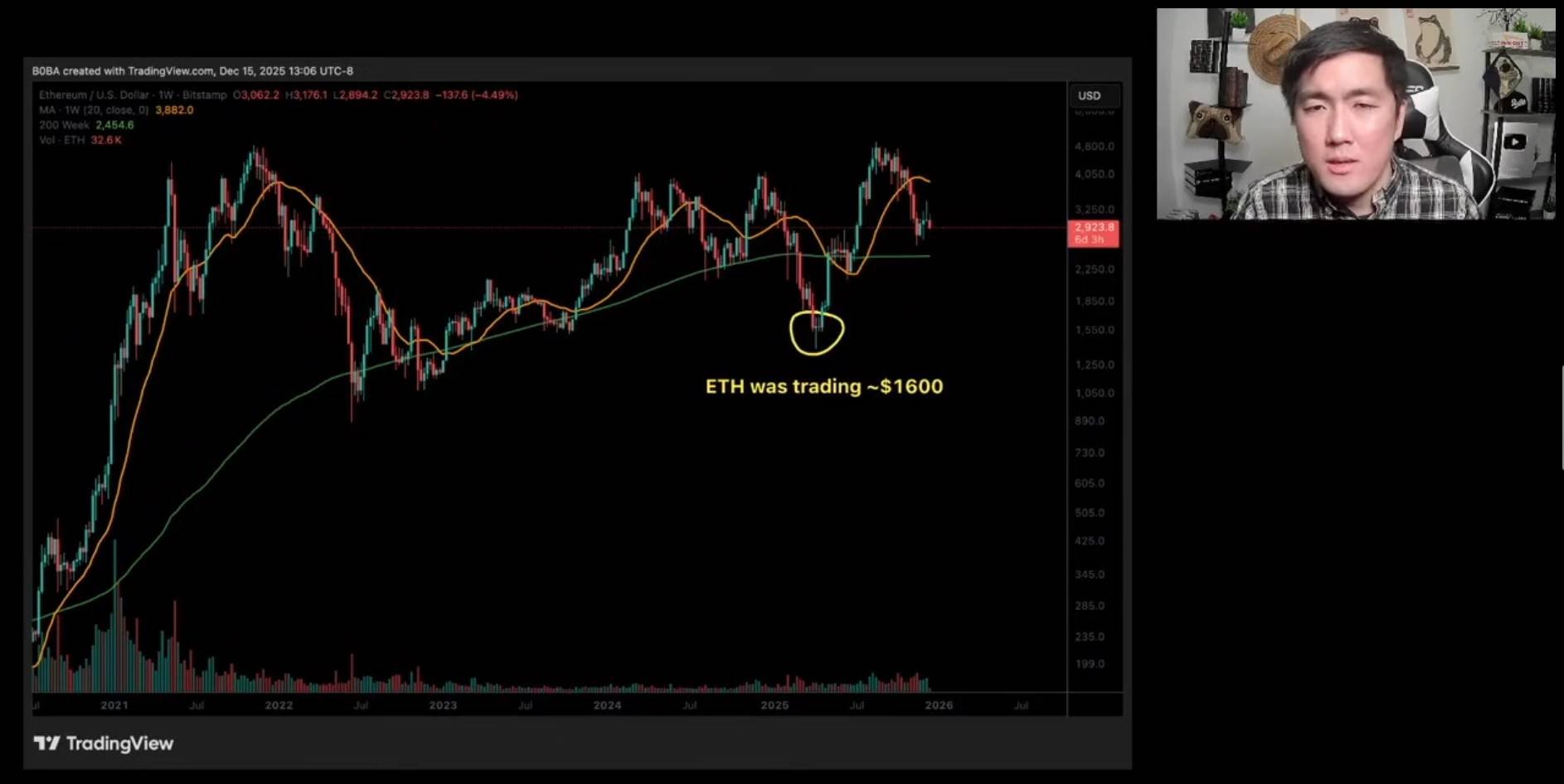 现在我认为我们处于第二部分,这和第一部分有些相似。Tom Lee 一直是我做空 ETH 的一个原因,因为我认为他将价格推高到了公允价值之上。因此,将价格做空回落是有道理的。但我仍然认为他正在支撑着 ETH,这提供了一个有趣的机会。因为我认为一旦他资金耗尽或开始用完钱,ETH 就会真正回归到公允价值。