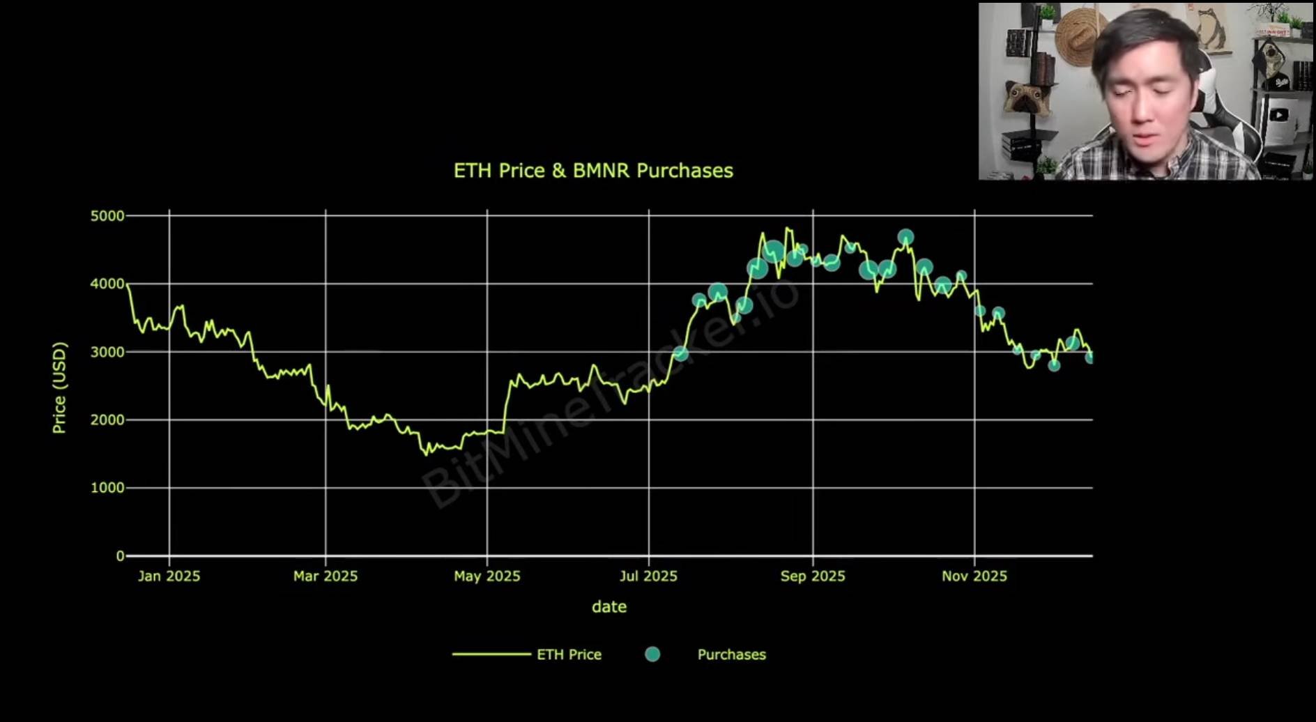我认为 Tom Lee 将 ETH 的价格炒高了很多,现在他购买 ETH 的数量随着时间推移越来越少。我认为 ETH 将会收敛到公允价值。我不知道公允价值是多少,但它可能会低得多。你可以看到,这是 Tom Lee 的活动,他在 4,000 美元以上买入了很多,但如果你理解 DATs 的运作方式,当加密货币上涨时,人们会涌入这些资产,因为市场具有反身性。所以这些 DATs 在上涨过程中大量买入,然后一旦行情持续下跌很长一段时间,他们就无法持续购买了。