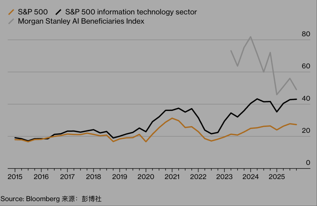(这张图用三条指数线(标普 500、标普 500 信息技术板块、摩根士丹利 AI 受益指数),展现 2015 - 2025 年美股中,人工智能概念相关股票先借炒作大幅飙升、后因泡沫退潮回落,与大盘及传统科技板块走势分化的过程,反映 AI 领域投机热潮及退潮风险。)