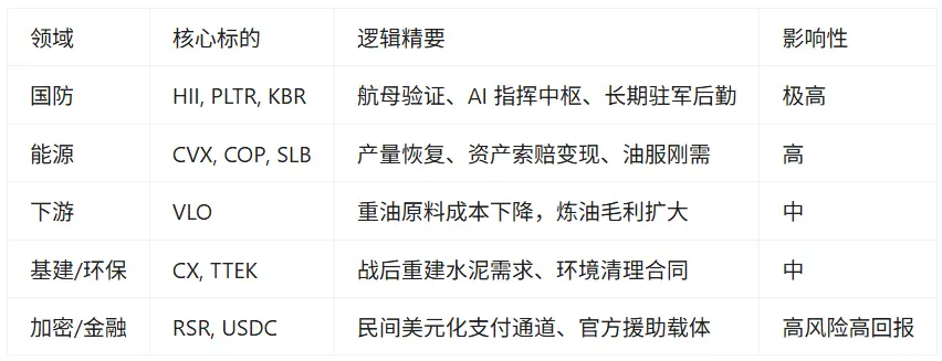 短期内,战争恐慌可能推高油价,但中长期来看,委内瑞拉的回归是巨大的供给侧冲击。如果产量在数年内恢复到 300 万桶 / 日,将对 OPEC 的减产努力构成巨大挑战,可能导致油价长期承压。但这对于以炼油和化工为主的下游企业,以及航空运输业(如达美航空 DAL、联合航空 UAL)是重大利好。
