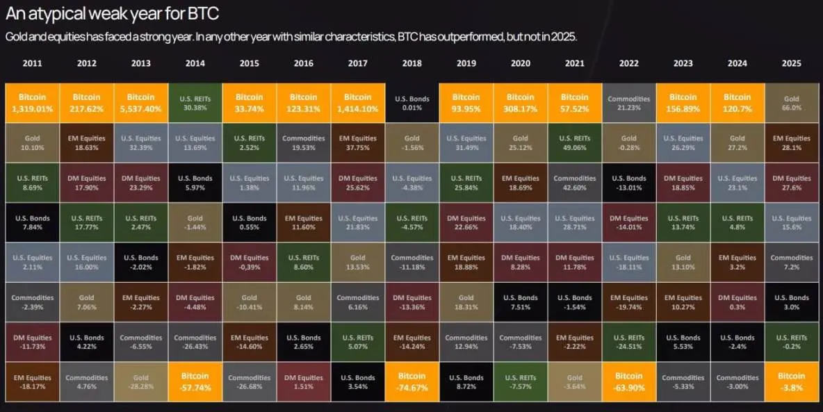 比特币在 2025 年的资产表现中排名接近末尾,跌幅为 3.8%,在这个对比特币而言非典型的年份里,其表现落后于黄金和股票。