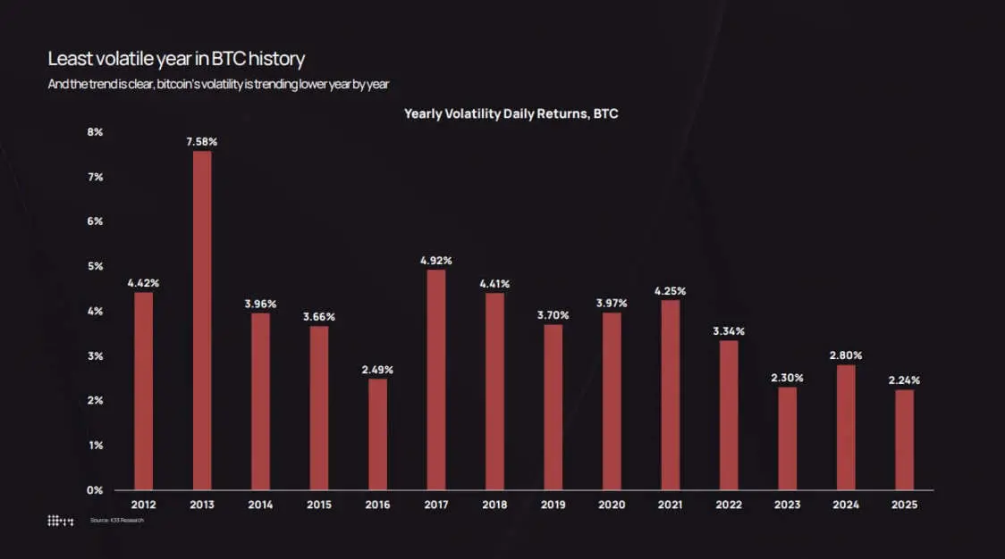 根据 K33 Research 的数据,比特币的年度波动率从 2013 年 7.58% 的峰值下降到 2025 年 2.24% 的历史低点。