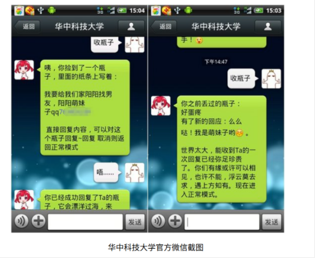 推出 3 天时间里,微信后台的回复量就达到 4 万条,让许多学生爱不释手。而从后台反馈的数据来看,求男女友、树洞吐槽等占据了漂流瓶的主要内容。