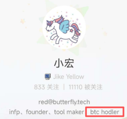 没错,其实在肖弘的「即刻」个人主页上,他给自己的标签除了 founder、infp、 tool maker,还有一个简洁的身份:BTC Holder(比特币持有者)