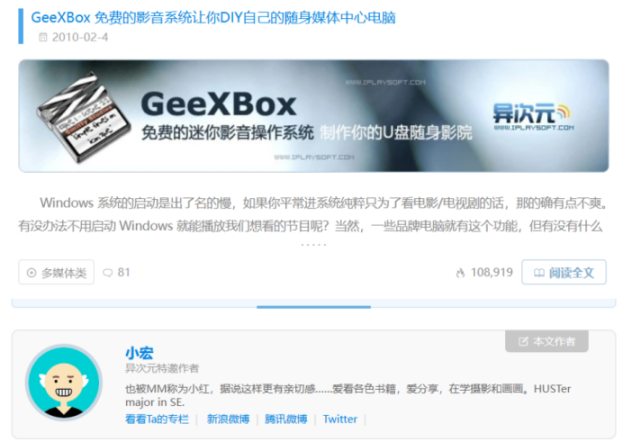 在「异次元软件世界」社区,我们现在还能看到他撰写的大量内容。其中,最早一篇写于 2010 年的《GeeXBox 免费的影音系统让你 DIY 自己的随身媒体中心电脑》阅读量达 10 万