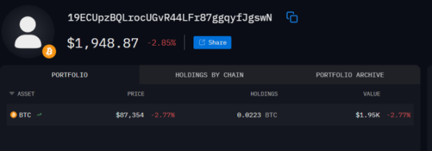 我出于好奇查了一下那个地址。2014 年 2 月,那个地址里的持仓价值仅为 0.793 美元;12 年后的今天,这笔资产价值 1969 美元 。