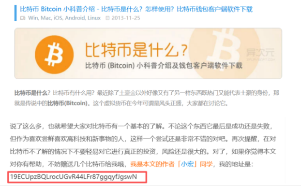 在当时比特币未进入大众视野的年份,大多数人还将其视为「郁金香泡沫」或「极客的玩具」,但当时的肖弘已经在文章最后像模像样地贴出了自己的钱包地址,并写道「随便买几块钱放到自己钱包里吧,瞧瞧这逼格。」
