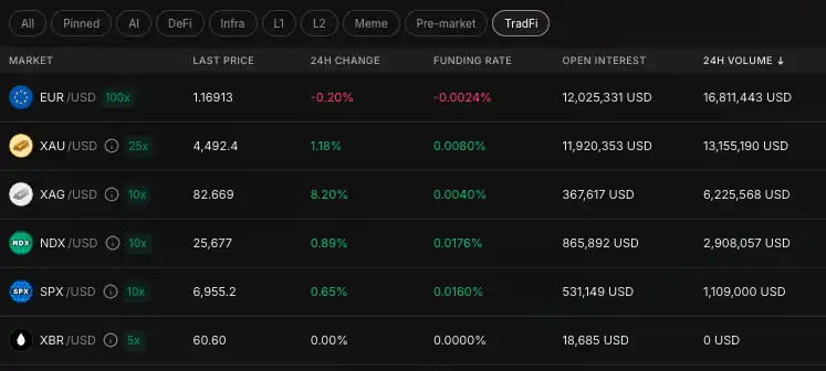 Extended 的产品设计目前看起来也基本很完善了,除了主流加密货币之外还覆盖了六种 TradFi 资产:标普 500、纳斯达克的股指,欧元兑美元的外汇,贵金属的黄金、白银,以及大宗商品的石油。从 OI 分布看,黄金交易一直在 Extended 的前 5 位,这也说明 TradFi 资产确实有不小的真实需求。