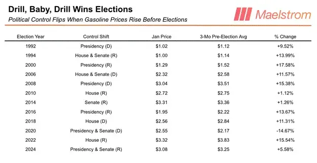 「10% 规则」:如果在选举前三个月,全国汽油平均价格相较于同一自然年 1 月的平均水平上涨 10% 或以上,那么政府的一个或多个权力分支,往往会发生政党易手。