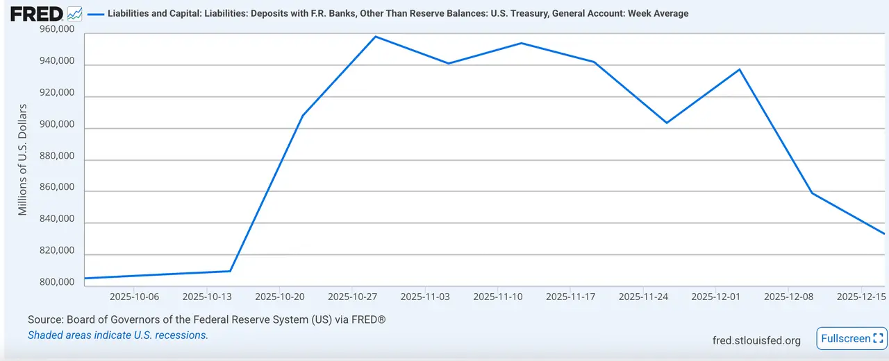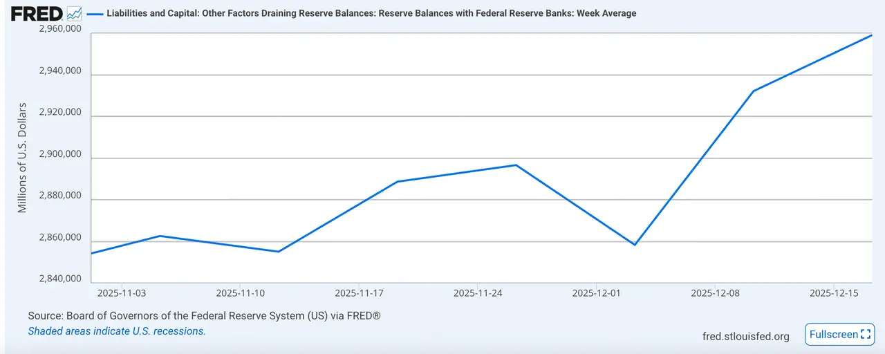 具体从流动性指标来看:截至12月18日,财政部TGA账户余额为861亿美元,较前期下降,释放资金进入市场;商业银行准备金约2.94万亿美元,自12月以来出现明显反弹,表明银行间美元流动性状况出现改善。从关键利率来看,SOFR-IORB也从前期高位回落,显示流动性持续偏紧的状况有所缓和。