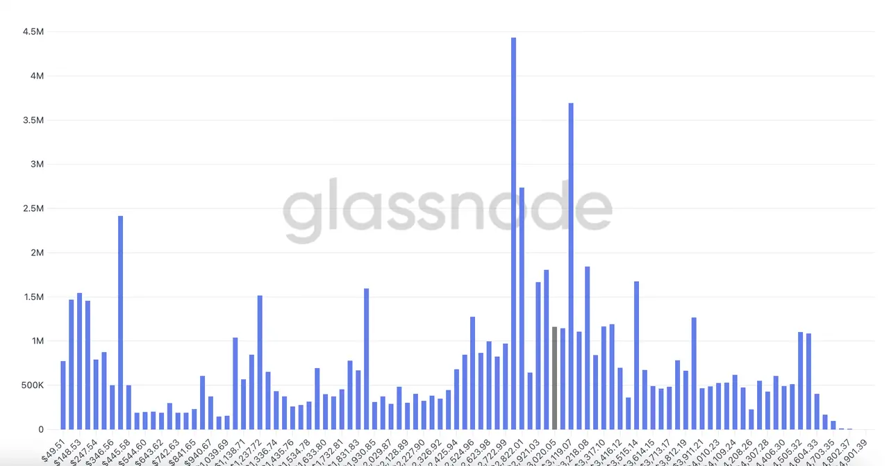 ETH的链上数据显示也有相似的筹码结构,在2800-3100美元价格区间累计较多,上方3500 有部分套牢筹码构成上行压力,左右2侧的巨量筹码堆积,使得价格短期在没有足够的触发因素推动的情况下难以出现明显的趋势行情。