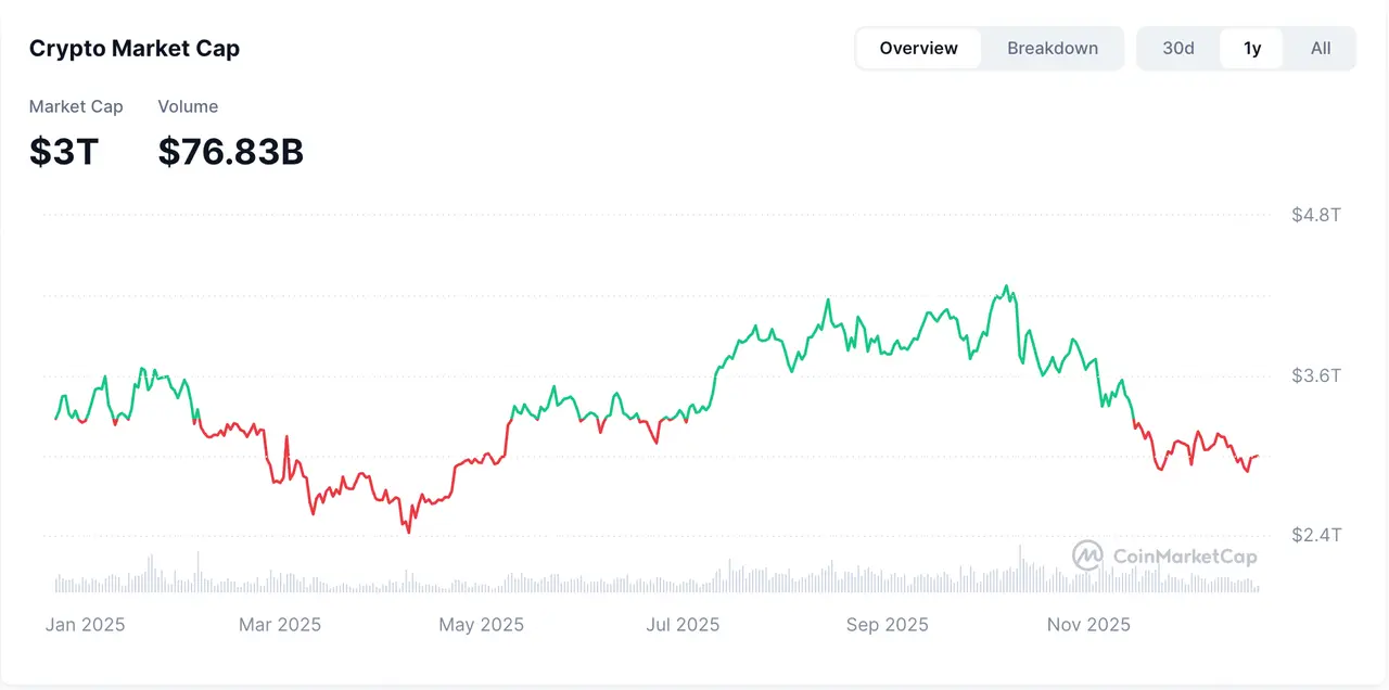 11月,整个加密市场面临重大下行压力,延续10月清算级别的下跌势头,加密货币总市值在11月下降15.43%,月末收于约2.8万亿美元,从10月的4.2万亿美元大幅回落。